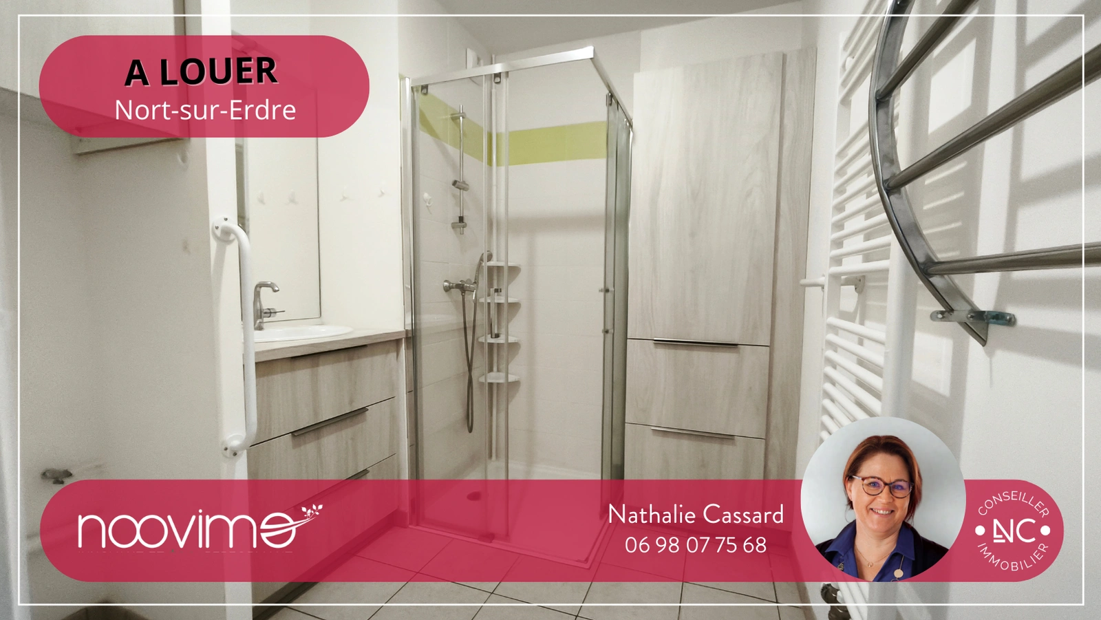 Votre conseillère Noovimo Nathalie CASSARD 06 98 07 75 68 ncassard@noovimo.fr vous propose : À LOUER - Appartement LUMINEUX en résidence T3 68 m2 au coeur de Nort-sur-Erdre ! LIBRE DE SUITE ! en PLEIN COEUR de NORT-SUR-ERDRE, venez découvrir, cet appartement lumineux de 3 pièces situé au 2ème étage d'une résidence récente de 2020, Idéal pour un cadre de vie agréable et fonctionnel. À proximité immédiate de toutes les commodités : commerces, écoles, transports, services. Caractéristiques : Type : Appartement T3, Niveau : 2ème étage avec ascenseur, Surface habitable : 68,35 m2 Carrez. DPE C (66) GES C (12) Chauffage et eau chaude individuel au gaz. Eau froide, espaces verts communs et entretiens parties communes compris dans les provisions sur charges mensuelles et donnant lieu à une régularisation annuelle. Disposition : 1 entrée avec un meuble d'entrée et un placard dans le couloir desservant la partie nuit, 1 pièce de vie lumineuse avec cuisine aménagée et équipée (hotte, plaque gaz, réfrigérateur avec congélateur et machine à laver) ouverte pour une surface de 27,30 m2 au total, 2 chambres dont une PMR de 11,70 m2 aménagée d'un meuble-pont de qualité et l'autre de 9,53 m2, 1 Salle d'eau de 4,92 m2 avec rangement et espace pour la machine à laver, 1 WC PMR indépendant avec lave-main, 1 balcon en L de 14,25 m2 orienté Sud-ouest, 1 emplacement de parking sécurisé. Conditions financières : Loyer mensuel : 820 EUR hors charges Charges : 100 EUR (ascenseur, entretien parties communes, entretien chaudière et eau froide :provisions mensuelles avec régularisation annuelle ) Loyer total charges comprises : 920 EUR Dépôt de garantie : 820 EUR Honoraires locataire : 748 EUR TTC, dont 204 EUR pour l'état des lieux. ATTENTION DOSSIER ETUDIER AVEC LA GLI Le dépôt des dossiers se fait sur le site Zelok à https://www.zelok.fr/ de NOOVIMO NATHALIE CASSARD Aucune visite ne sera organisée sans validation du dossier en GLI. Nos honoraires sont consultables sur : www.noovimo.fr. Ref : NCD-0025581. Annonce rédigée et publiée par un Agent Mandataire indépendant Noovimo inscrit au RSAC de Nantes sous le No 508 081 858 Les informations sur les risques auxquels ce bien est exposé sont disponibles sur le site Géorisques : www.georisques.gouv.fr 1 - Annonce rédigée et publiée par un Agent Mandataire -