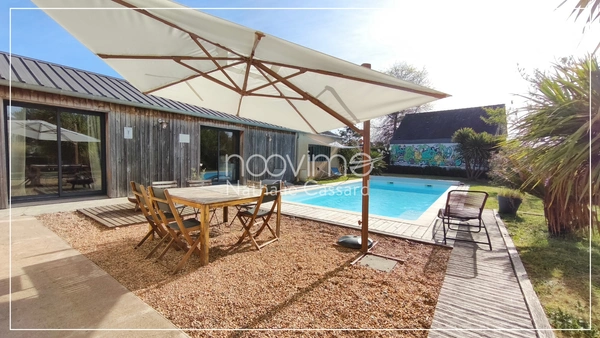 Les pièces de vie se succèdent avec une élégance naturelle : un séjour lumineux, une salle à manger conviviale, un salon plus intimiste ouvert sur la piscine, une cuisine contemporaine, et un espace bibliothèque avec poêle à bois Godin et sa mezzanine qui invite à la lecture, à la création ou simplement au calme. L'étage, composé d'un espace jeux et de trois chambres, dessine un univers nuit chaleureux et indépendant. Une extension rénovée récemment vient enrichir le potentiel déjà remarquable de cette maison. Elle propose deux chambres supplémentaires, dont une avec son propre accès extérieur et sa douche, un hall d'entrée et le pool-house de la piscine. Une configuration idéale pour recevoir sans se gêner, mais aussi pour créer une véritable harmonie dans les FAMILLES RECOMPOSÉES, pour imaginer un CO-LIVING respectueux de l'intimité de chacun, ou encore pour rapprocher plusieurs générations sous un même toit tout en préservant la liberté de tous.